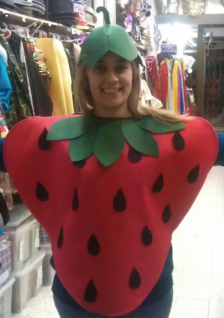 Siente el poder de la fruta en tu cuerpo. Disfraz de fresita divertido, alegre y sencillo. Cómodo de llevar.